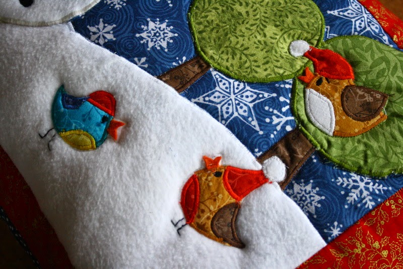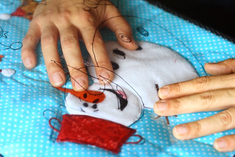 Polár használat: A rátétminták esetén előszeretettel javaslom, mert pihe-puha lesz tőle a minta. Az árokban tűzés hatására ráadásul úgy kiemelkedik, mintha külön alá lenne még tömve. 🙂 A hóember a képen látható mintán polárból készült havas domboldalon áll. Az alapnak használt polár viszont nagyon megnehezítette a készítést. A ploár könnyen nyúlik, ezért a forgatásakor deformálódott az alapom (amit később egyenesre kellett igazítani) ha valaki égis polárt szeretne alapnak használni, javaslom, hogy előtte erősítse meg az anyagot vetexel.