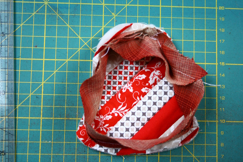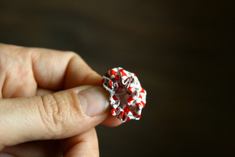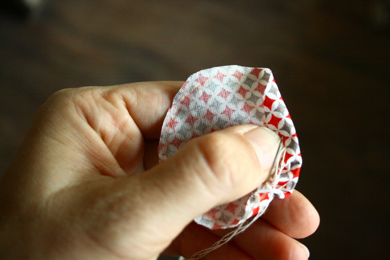 Vágj ki egy kb 5,5 cm átmérőjű kört. Hajtsd be a kör szélét és varrd körbe futóöltéssel.