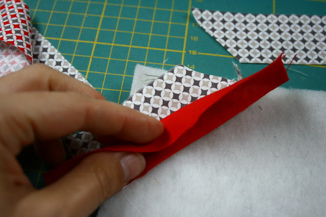 Az első darabot rakd a sarokba és színével lefelé fordítva tedd rá a következőt. A jobb oldalon varrd végig talpszélességben a két darabot. Ezzel rögzíted a béléshez és a hátlaphoz is.