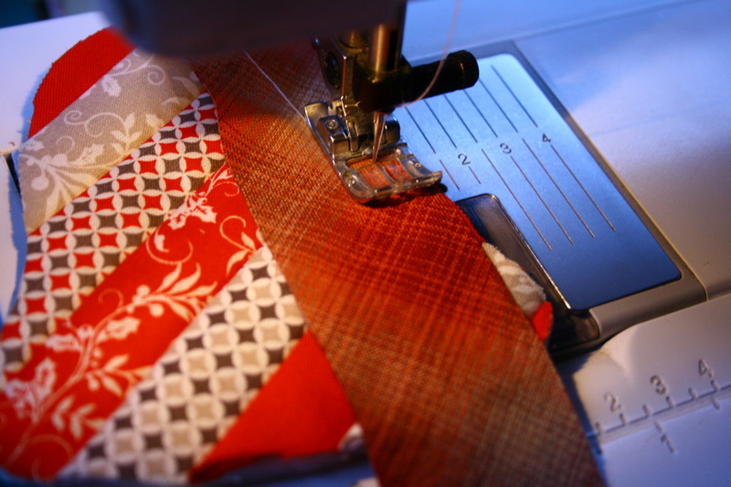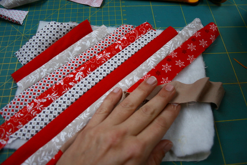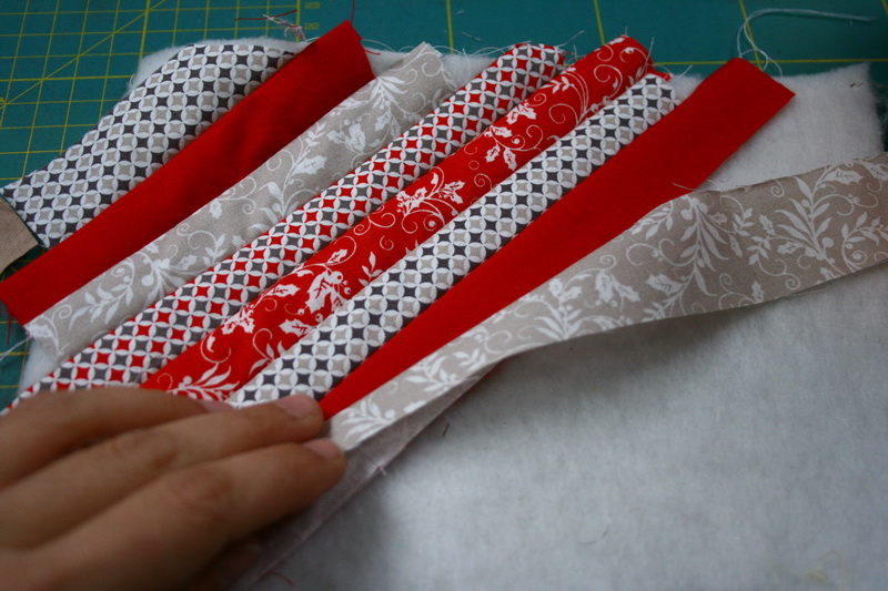 Vágj ki egy 15 x 25 cm-es téglalapot a hátlapból és a bélésből. Ragasztósprayvel ragaszd egymáshoz őket. A bal sarkából elindulva kezd el felvarrni a csíkokat az alapra.