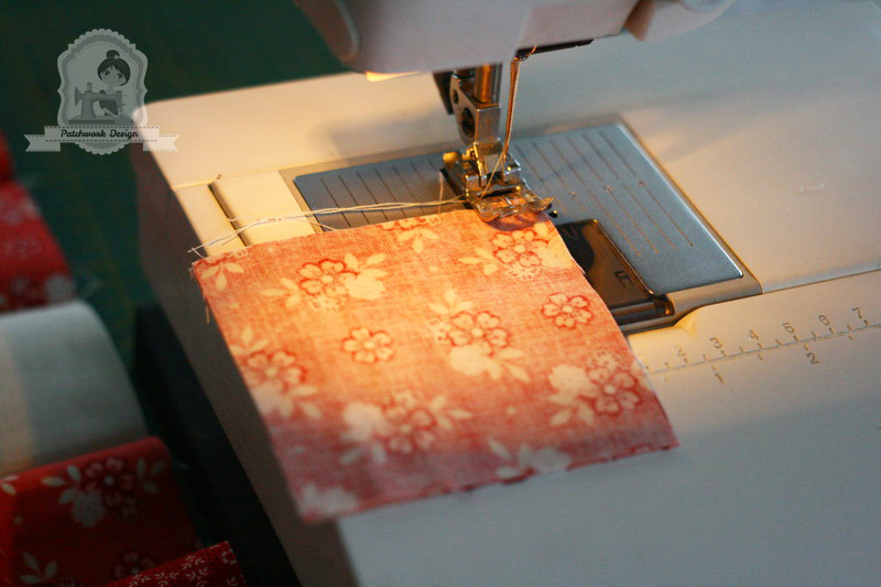 A négyzet varrásráhagyással együtt 6,5 cm x 6,5 cm. Az „átló” 2 cm – 4,5 cm-nél indul.