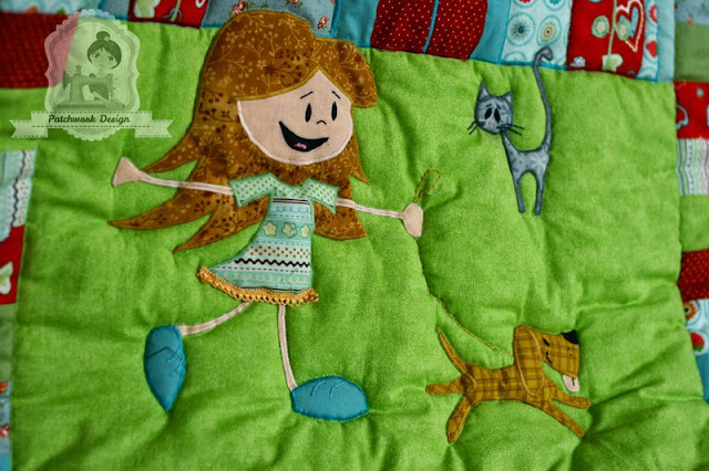 A szabásminta, egy az egyben nyomtatható és felhasználható, nem igényel külön nagyítást és számolgatást. Tartalmazza a háttérben látható házikókat, ablakokkal ajtókkal, a napocskát felhőkkel, a cicákat, a kismadarat, a kutyust és még Pannit is, a kislányt, aki a kutyát sétáltatja. Igen, Ő Panni, egyenesen Párizsból.