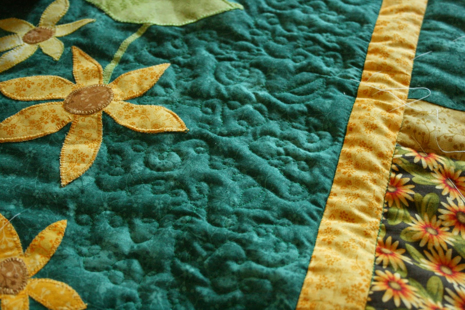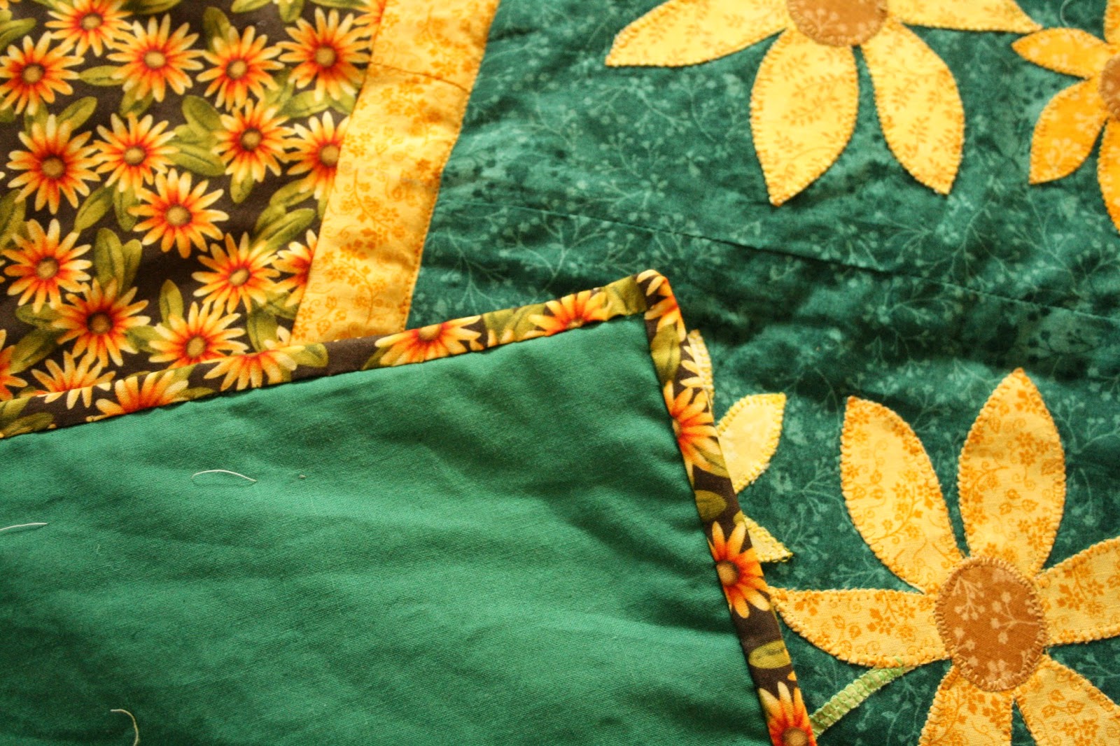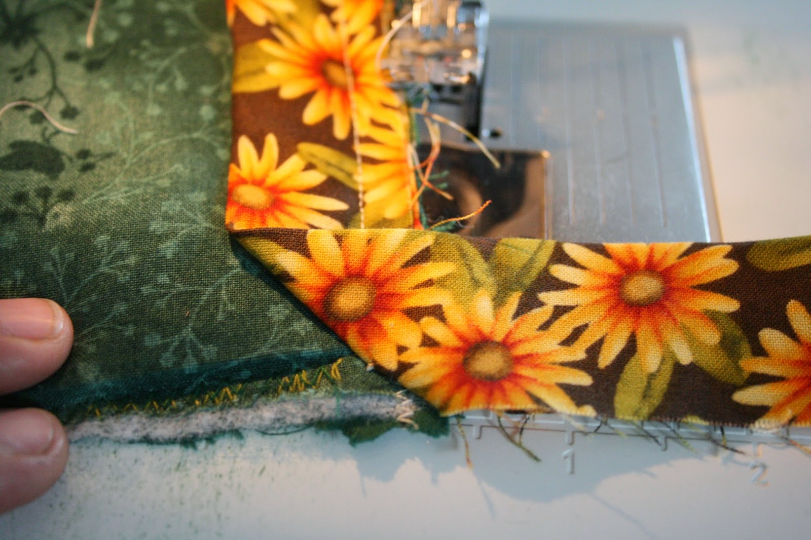 Ezután következett a szegély elkészítése. A margarétás anyagra esett a választásom. Elsősorban azért, mert a sötétzöld szélek miatt ez mutat a szélén a legjobban. Másrészt éppen volt belőle még akkora mennyiség, hogy elkészítsem a szegélyt! Jó tanács: Ha ilyen nagy munkát készítünk a szegélyre külön számoljunk fel anyagot!! Ezt a technikát általában 7 cm-es csíkkal szoktam megoldani. Most egy kicsit szűkebbre kellett vennem a szélességet.A végeredmény kb. 1 cm-es lett!