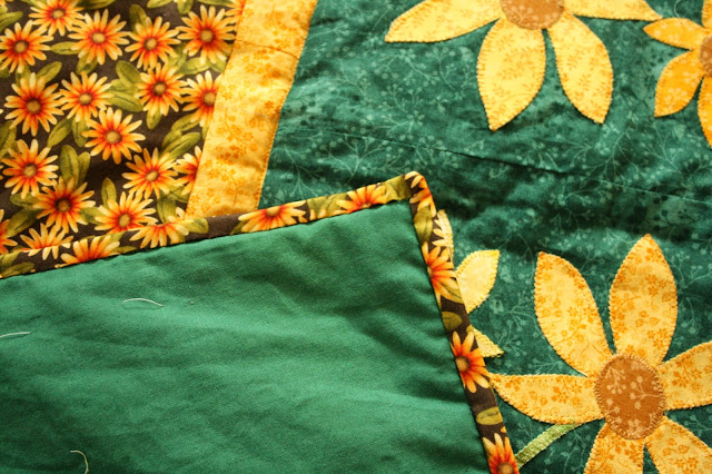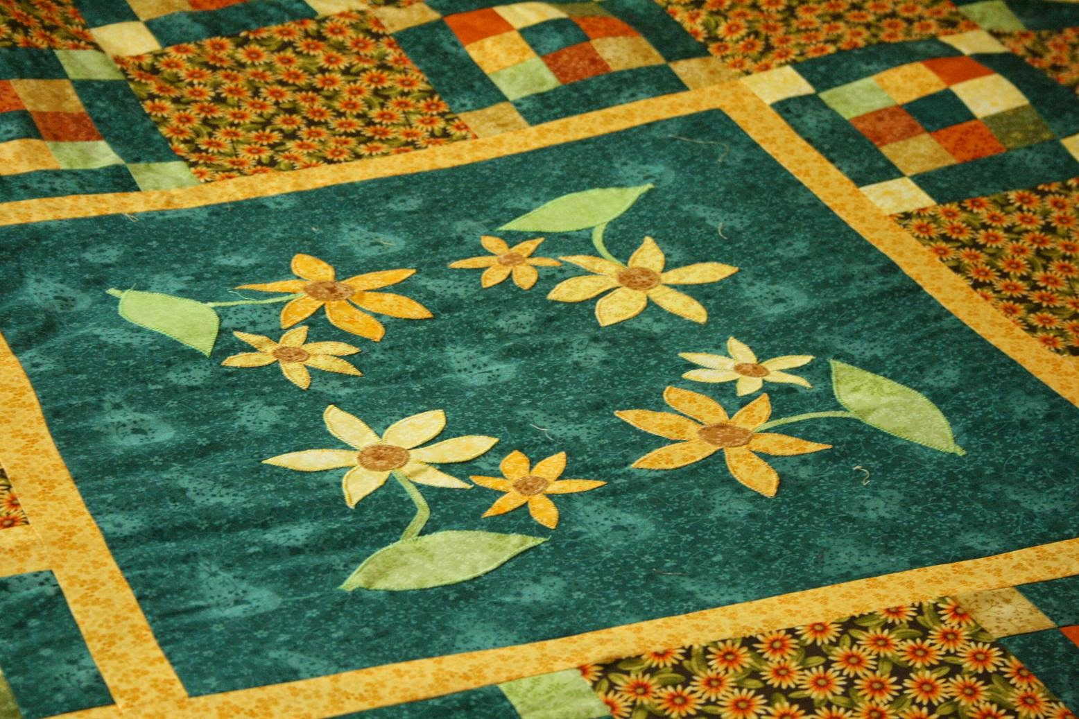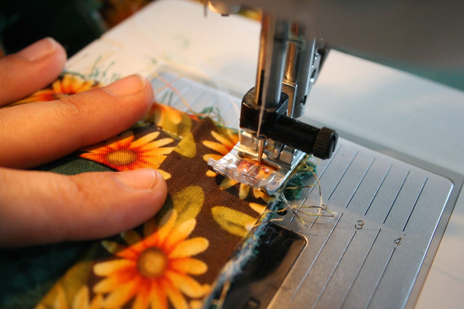 Ezután következett a szegély elkészítése. A margarétás anyagra esett a választásom. Elsősorban azért, mert a sötétzöld szélek miatt ez mutat a szélén a legjobban. Másrészt éppen volt belőle még akkora mennyiség, hogy elkészítsem a szegélyt! Jó tanács: Ha ilyen nagy munkát készítünk a szegélyre külön számoljunk fel anyagot!! Ezt a technikát általában 7 cm-es csíkkal szoktam megoldani. Most egy kicsit szűkebbre kellett vennem a szélességet.A végeredmény kb. 1 cm-es lett!