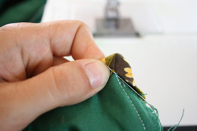 A sarkoknál csak a varrásszélességig megyek el. A gombostű ezt a pontot jelzi. Itt szükség van néhány oda-vissza öltésre: