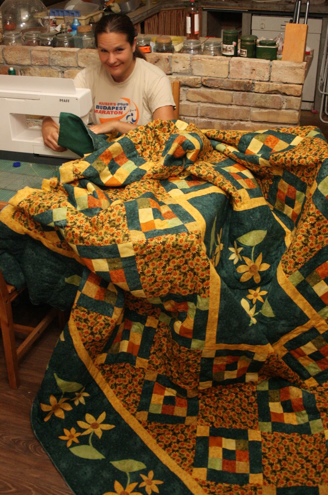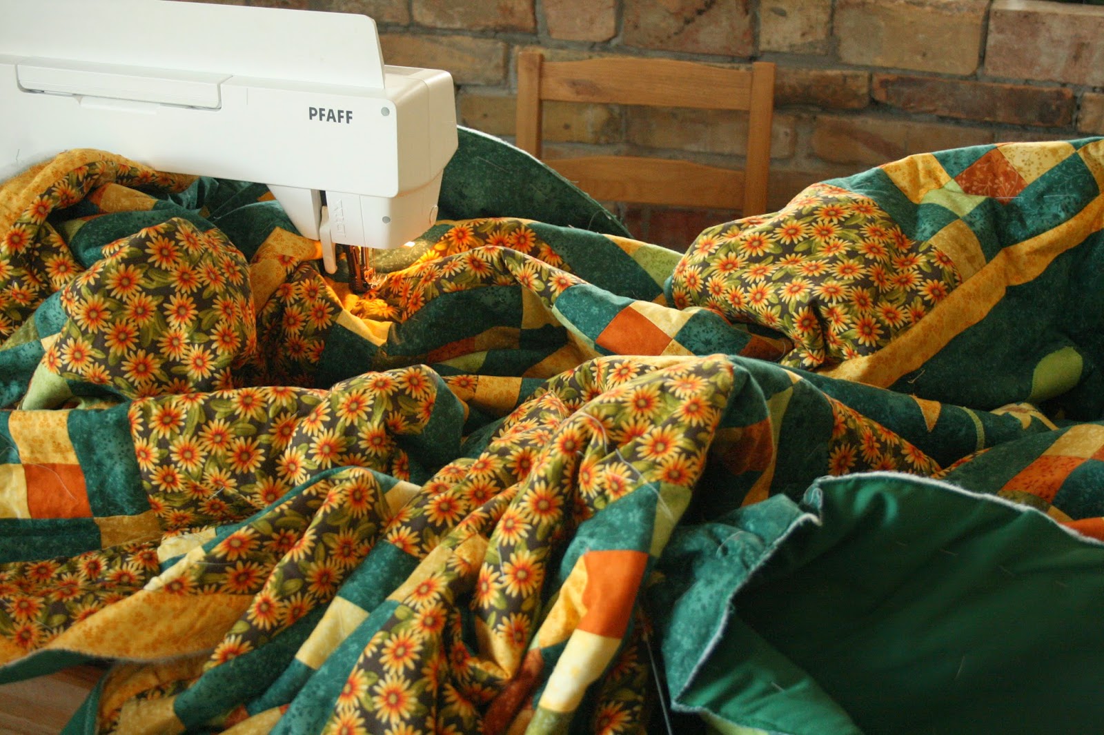 Igen, ezt a takarót már egy Pfaff géppel készítettem. Most biztosan sokan azt gondolják, hogy „Így könnyű!”. Természetesen vannak előnyei: kényelmes volt a hosszabb kar és az IDT (felső anyagtovábbító) használata is. De azért nem ehetetlen nagyméretű takarót készíteni egyszerűbb varrógéppel sem. Tapasztalatból mondom. 🙂 Sokat számított, hogy nem használtam vastag bélést és hogy a három réteg alaposan össze volt „dolgozva”.