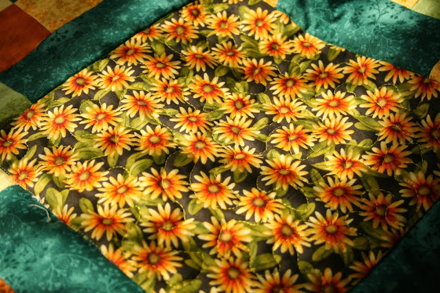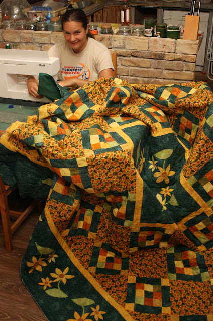 A következőkben a takaró kap bélést és hátlapot, majd mindezt tűzöm, hogy tartós legyen. A tűzés maga sokszor külön díszítés is a kész quilt munkán. Ebben az esetben nem érvényesül annyira. Ennek nemcsak az az oka, hogy nem használtam különlegesen szép díszítő motívumokat, hanem az is, hogy a takaró maga olyan élénk színű és mintás, hogy a tűzés eltűnik rajta!