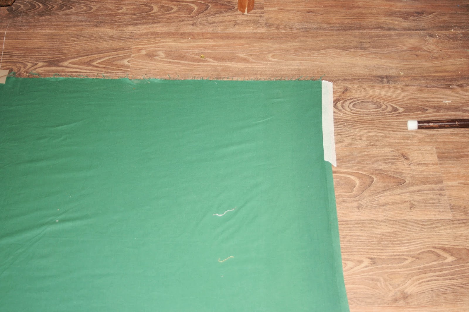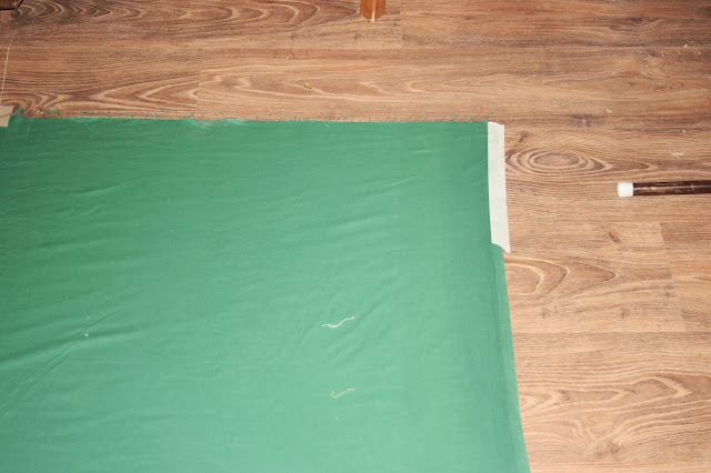 Első lépés, hogy a hátlapnak szánt anyagot rögzítsük a padlóhoz. Ebben az esetben egy zöld vásznat készítettem elő. A hátlap kétszer 140 cm x 250 cm-es darabból állt, amit előtte összevarrtam. Valamivel nagyobb volt így, mint amire szükségem volt, de sokkal kényelmesebben is lehetett rajta dolgozni!