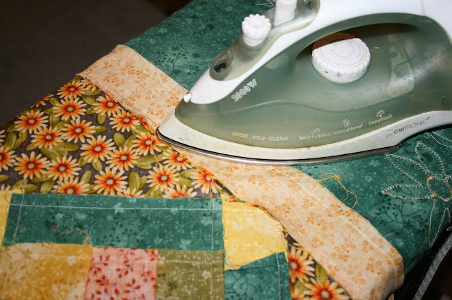 Mielőtt a három réteget összeállítjuk, alaposan ki kell vasalni a kész előlapot. Előszor a hátoldalán a varrások mentén, majd ezt követően a színoldalán is!