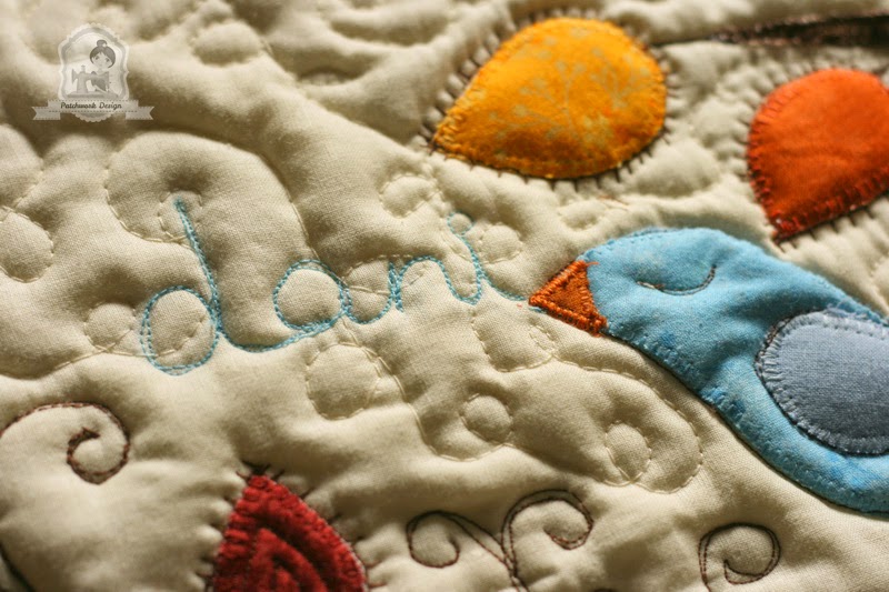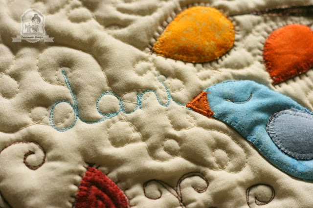 Ebben az esetben, nem az alapra applikáltam fel a rátétmintát, hanem már a kész quilt szendvicsre. Ragasztóspray-vel rögzítettem a bélést és a hátlapot és a három rétegre egyszerre varrtam rá a színes foltokat. Így az applikálás maga egyszerre tűzés is volt, amivel azt értem el, hogy a minták kiemelkedtek a háttérből.