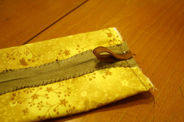 Kézzel belevarrjuk a cipzárt is, úgy, hogy a külső oldalon a szegőpánt takarja. Két akasztót helyezzünk el a kulcstartón. Az egyiket rögzítsük a cipzár belső oldalán (A képen látható módon) A másikat, pedig a külső rétegek közzé tegyük be, úgy hogy a belső rész felé nézzen.(tehát a cipzár másik oldalán is legyen egy akasztó) Összehajtjuk a munkánkat, hogy a cipzár középre essen és levarrjuk a két oldalán.