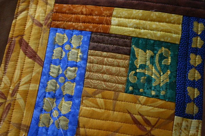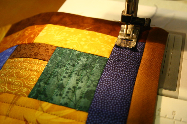 A mintás anyagdarabokat quilt-as-xou go technikával sorban rávarrjuk a kesztyűbéléssel ellátott molinóra.