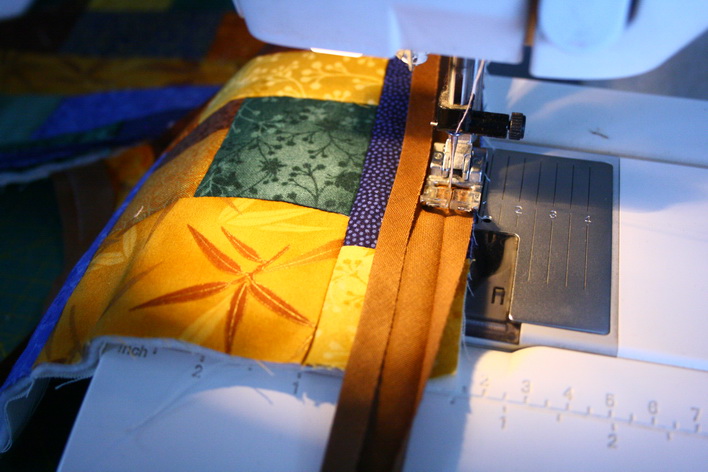 A két szélén, a színén felvarrjuk géppel a szegőpántot, a hátoldalon pedig kézzel.