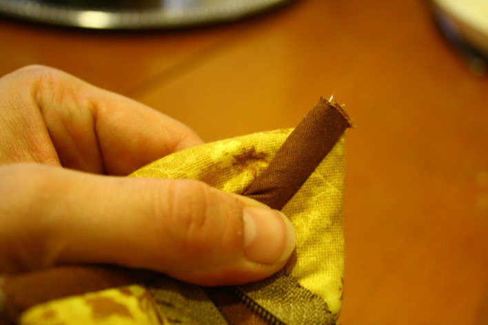 Fogjuk össze a varrást és a csücsöktől számított 1-1,5 cm-re varrjuk össze a csücsköt. Ettől lesz egy kis mélysége a zsákocskánknak.