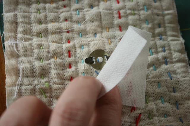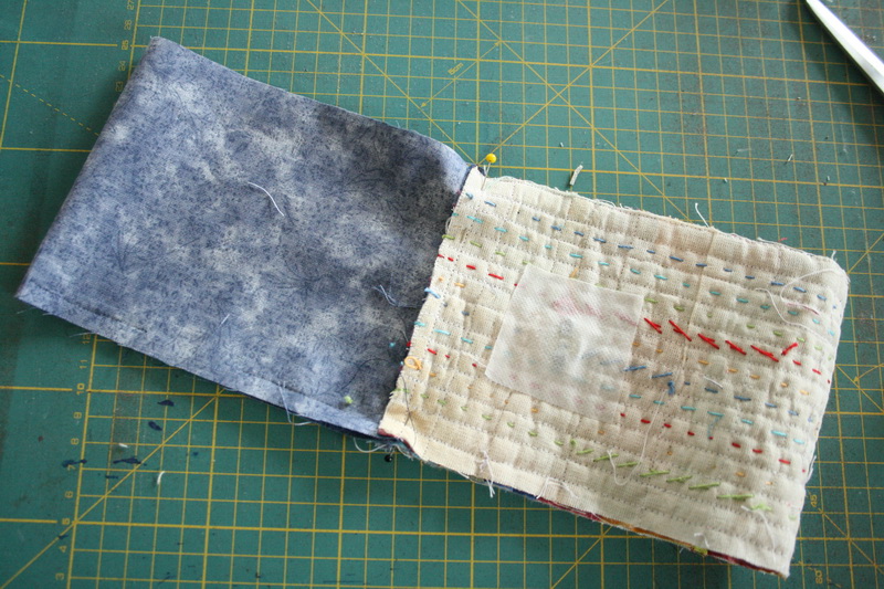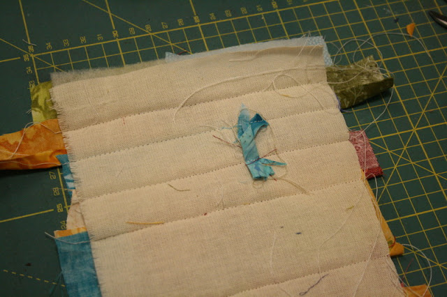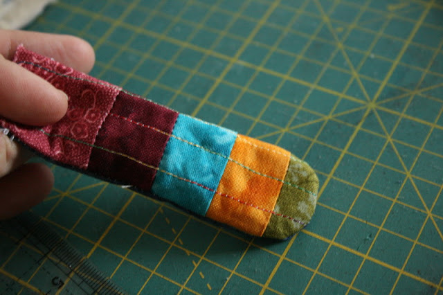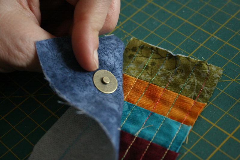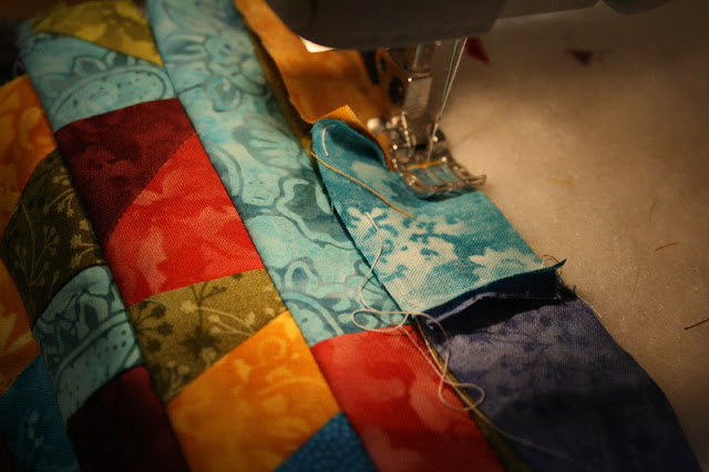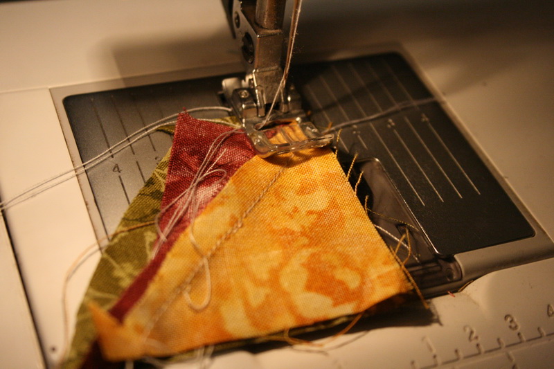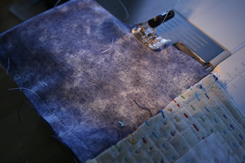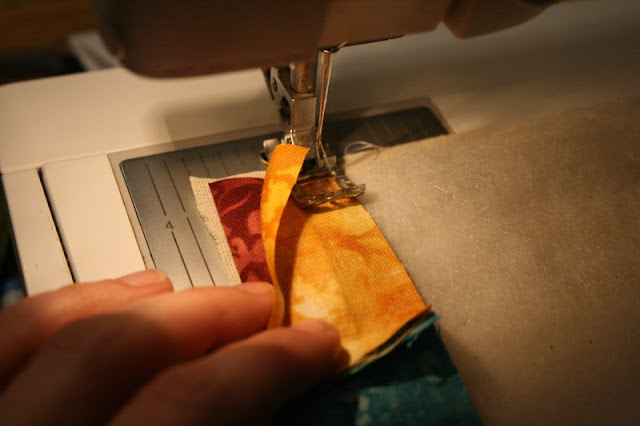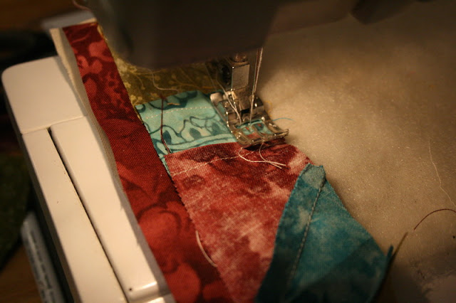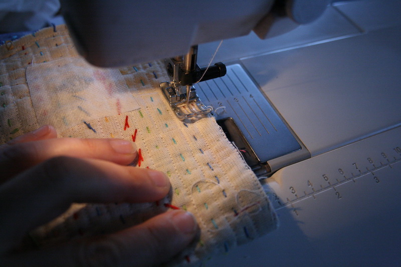 Majd a molinóra ráhelyeztem a vékony félízt és quilt-as-you go technikával elkezdtem felvarrni a darabokat.